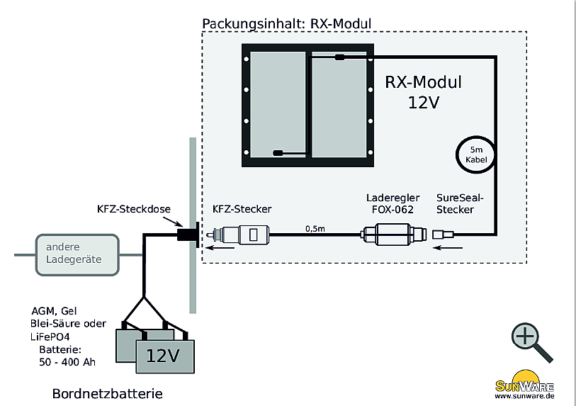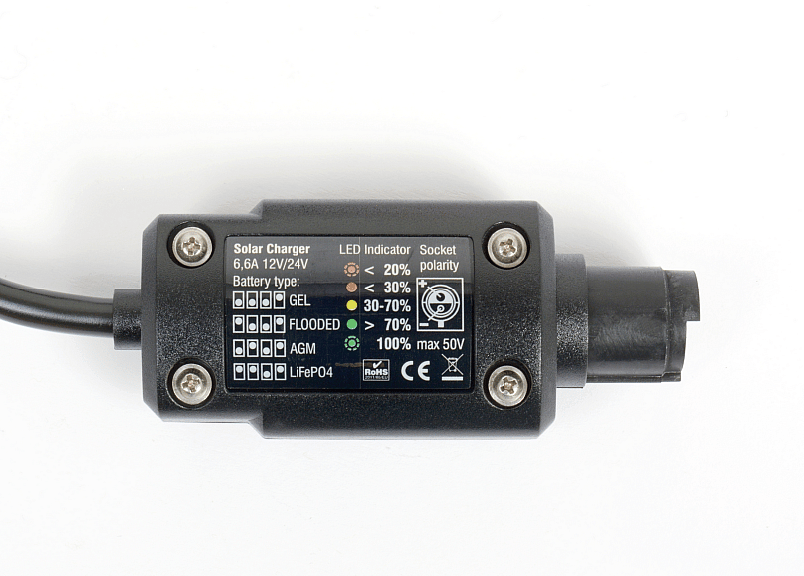 Plug & Play "in cable"-solution with mini solar charge controller, adjustable to battery type, and car socket plug with integrated fuse at one side. On the solar input side there is a SureSeal socket, a module cable with SureSeal connector can be plugged. The FOX-062 has an integrated LED and reverse current protection. A charging efficiency of 98% is achieved. In contrast to MPPT controllers this type of controller has an up to 20% higher efficiency when using 12V or 24V Solar modules.