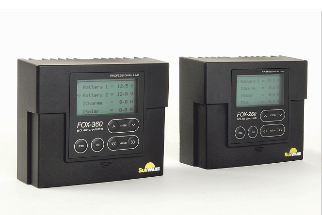 Programmable charge controller with integrated LCD display, 1 or 2 seperate battery systems. FOX-360/260 are characterized by its easy use and a compatibility with AGM, Gel, LeadAcid, LiFePO4 batteries. Display and setting options for battery voltage, charging current, generated panel current, power consumption, battery charge status as bar graph-, charge ratio B1/B2 is adjustable. The controllers are designed for up to 22A charge current incl. over charge protect. FOX-360: for 2 batterie syst.